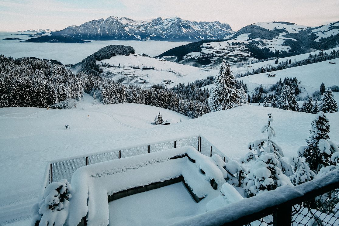 Nach der Anreise mit der Gondelbahn dürft ihr euch am Frühstücksbuffet bedienen und mit einem Glaserl Sprudel auf den Kurztrip einlassen.
