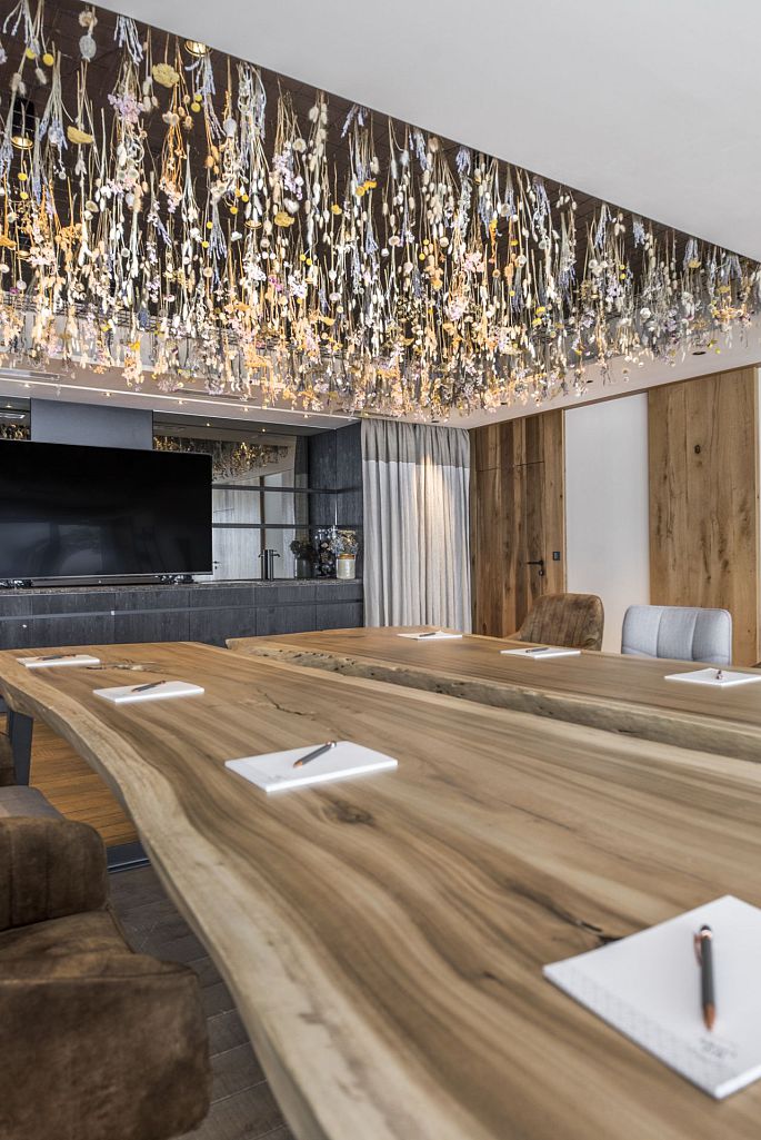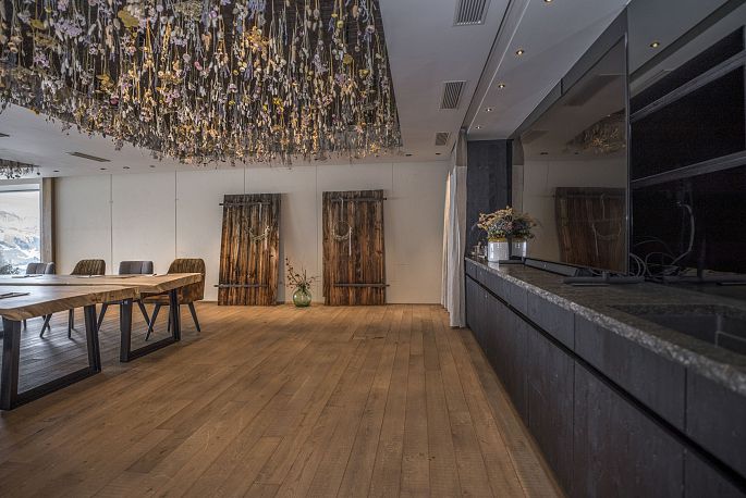 Eichenholzboden, duftende Heublumen von der Decke und raumhohe Panoramafenster sorgen für freie