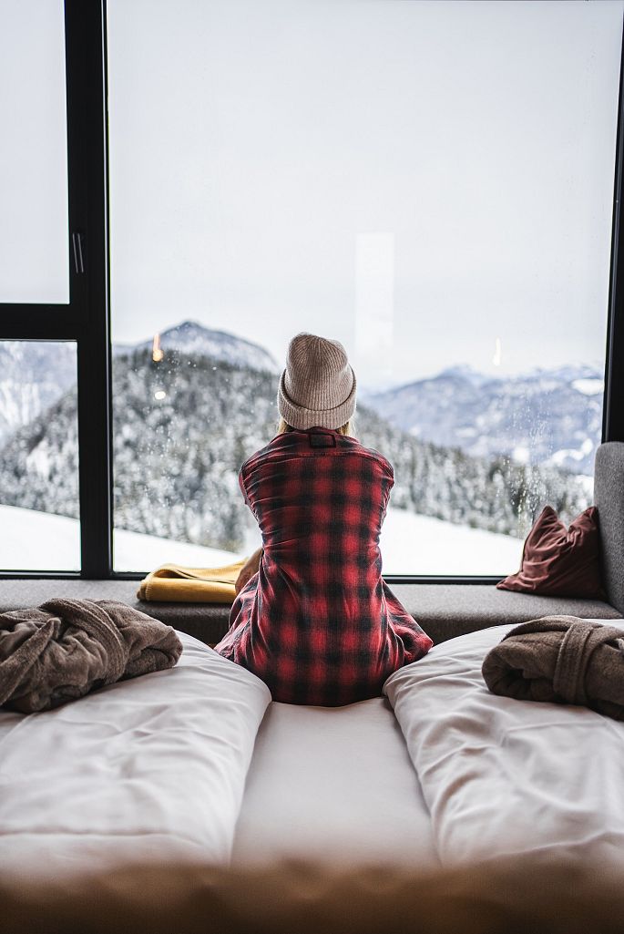 Nach der Anreise mit der Gondelbahn dürft ihr euch am Frühstücksbuffet bedienen und mit einem Glaserl Sprudel auf den Kurztrip einlassen.