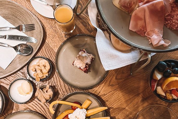 Nach der Anreise mit der Gondelbahn dürft ihr euch am Frühstücksbuffet bedienen und mit einem Glaserl Sprudel auf den Kurztrip einlassen.